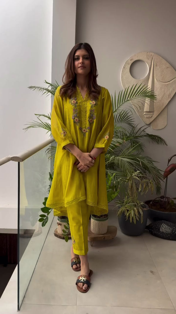 Lemon-Yellow Pero Chanderi Kurta Set with Floral Shoulder Yoke