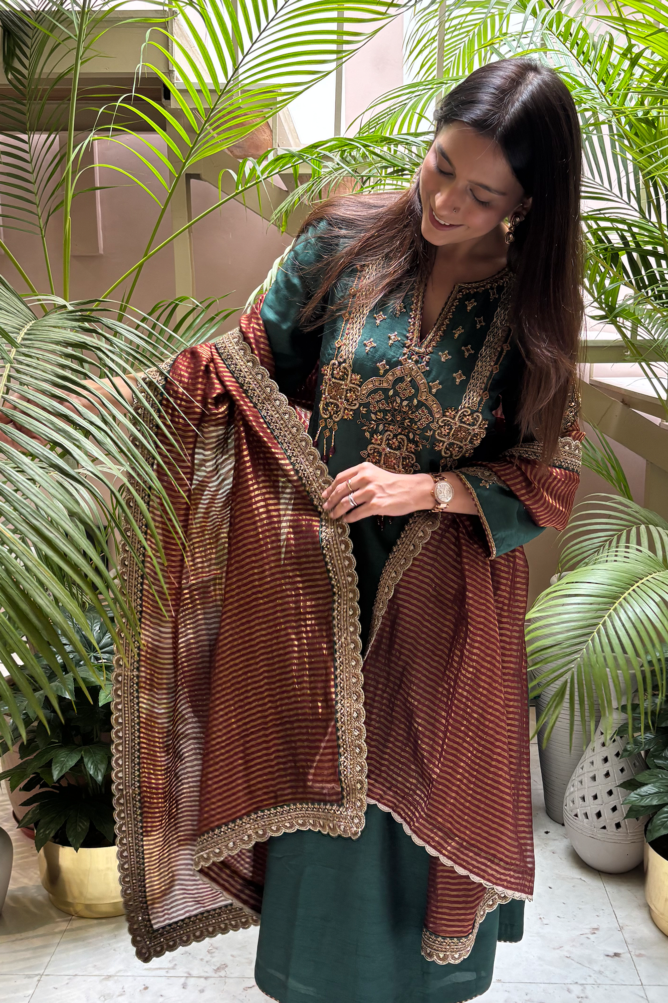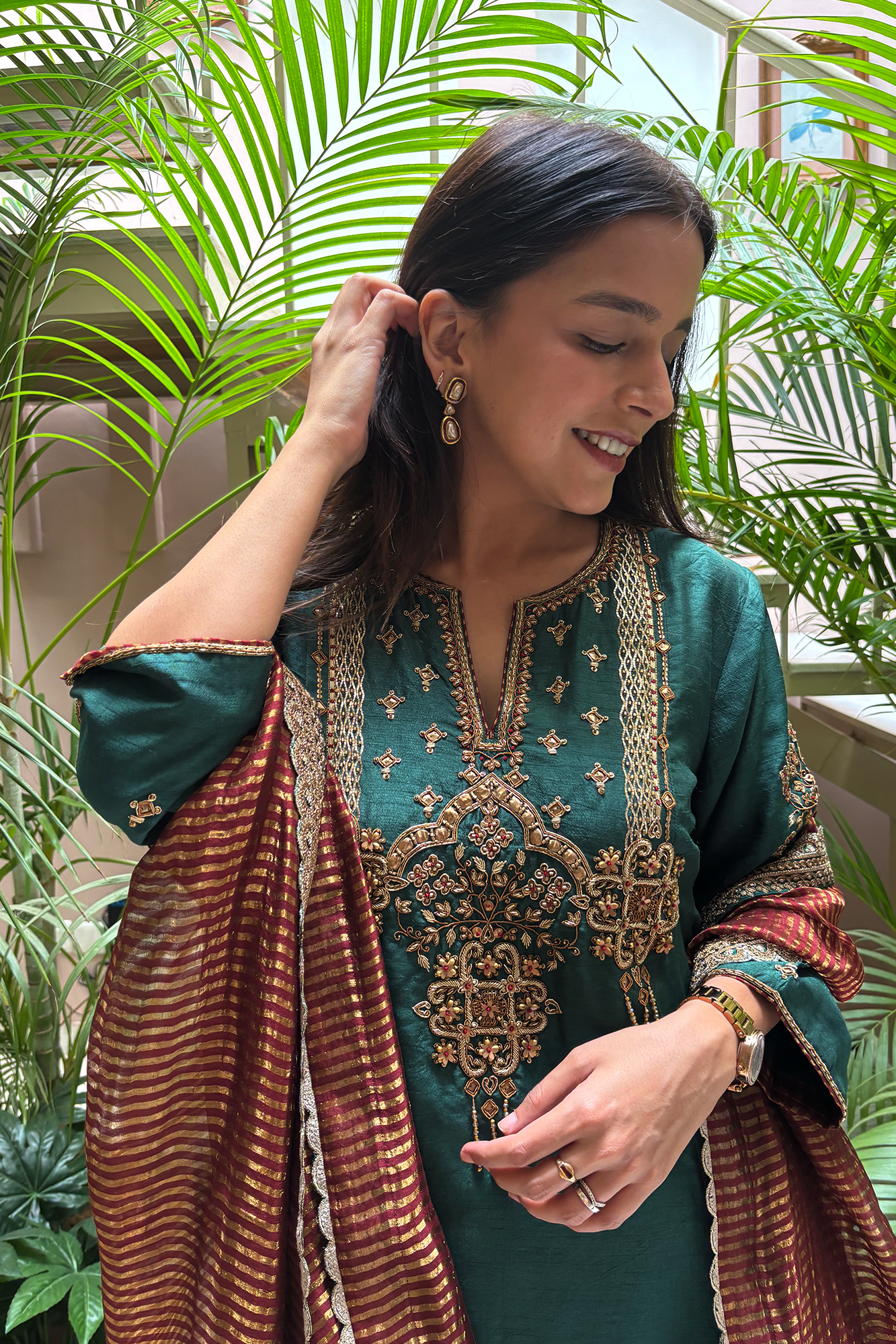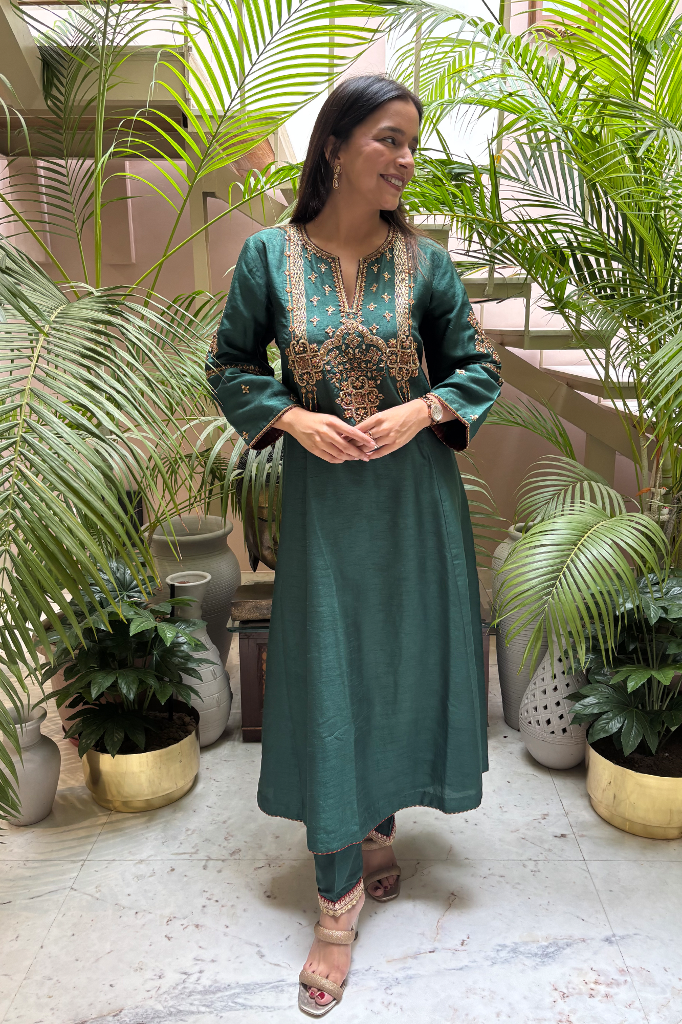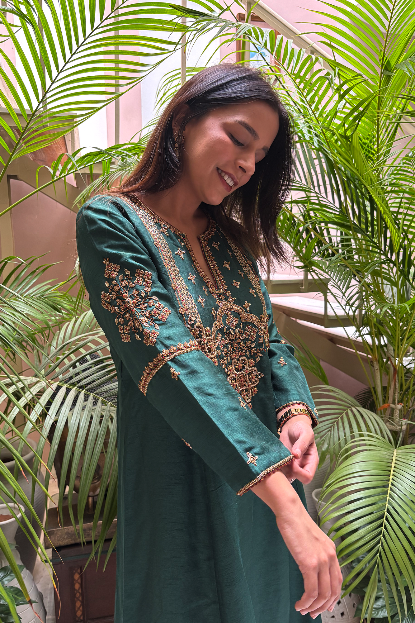 Make a regal statement with this emerald green silk kurta set, featuring a stunning hand-embroidered yoke in dabka and sequin work, enhanced with beaded tassels hanging delicately from the motifs. The sleeves are adorned with dainty hand-embroidered butis and elegant gold borders, adding a touch of intricate craftsmanship to the design.