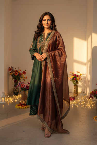 This set is beautifully paired with a gold-striped green tissue dupatta, finished with a rich maroon edge and a luxurious scallop border.