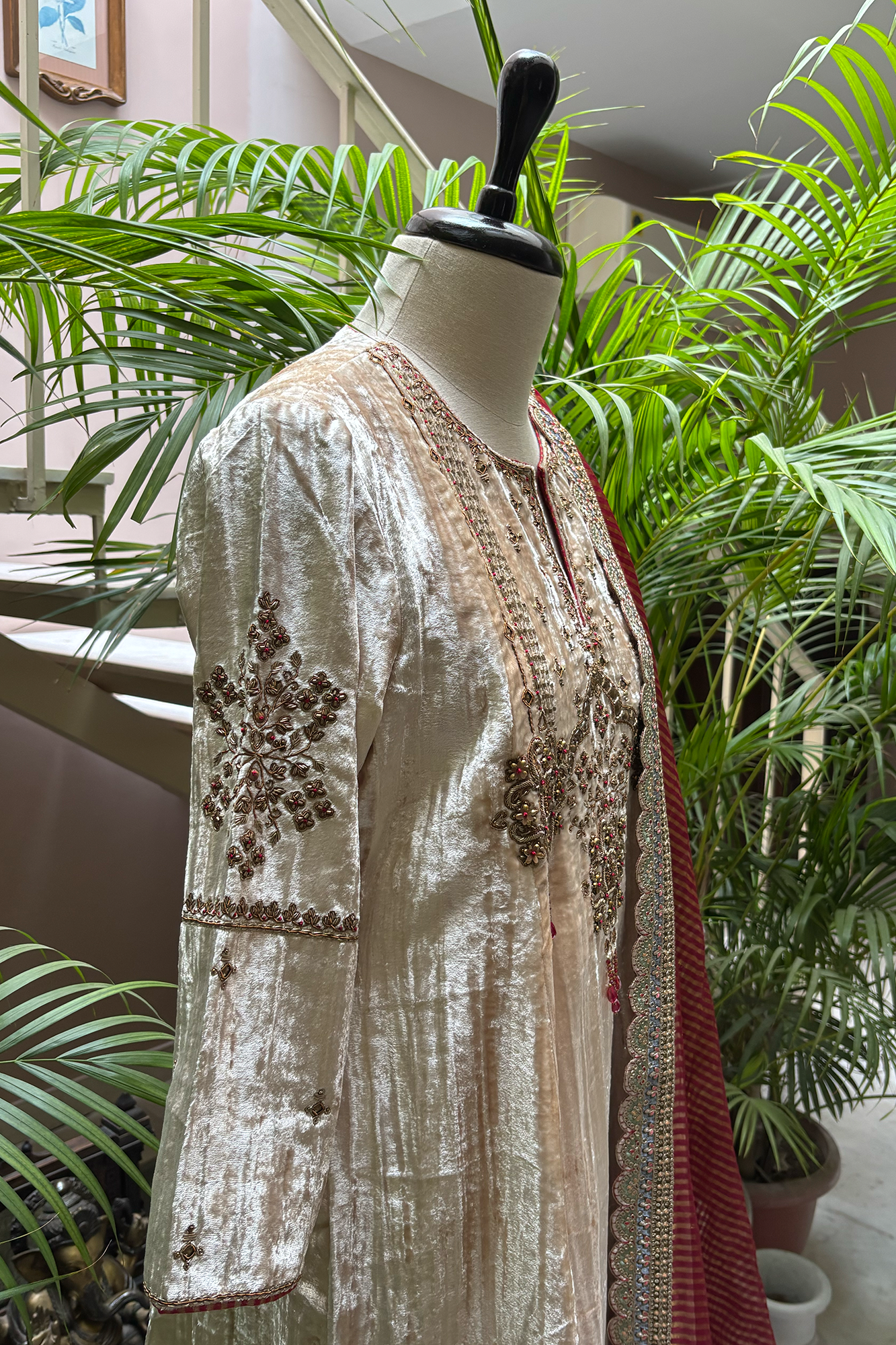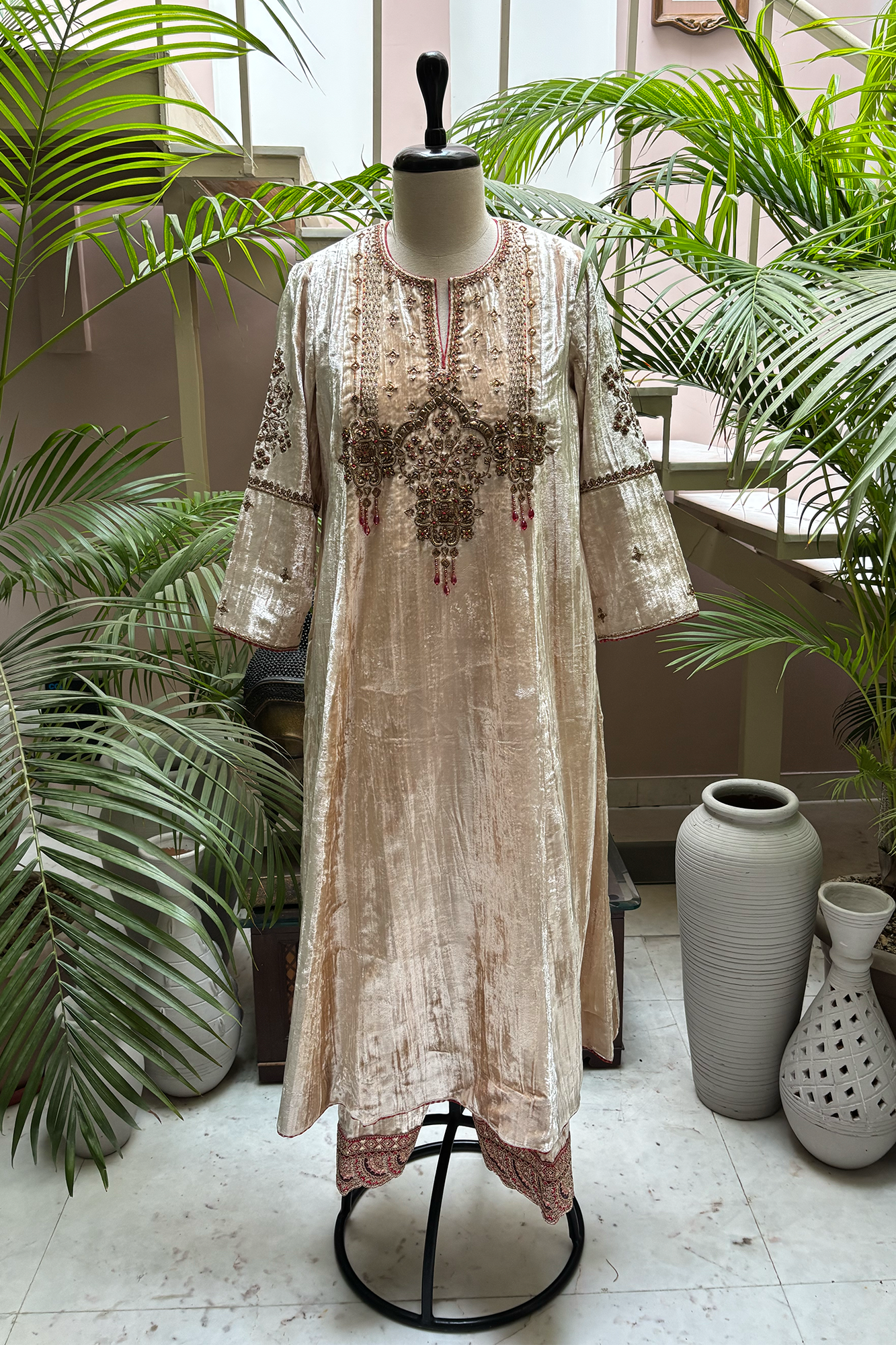 • Light Cream Velvet kurta with hand-embroidered yoke in dabka and sequin work