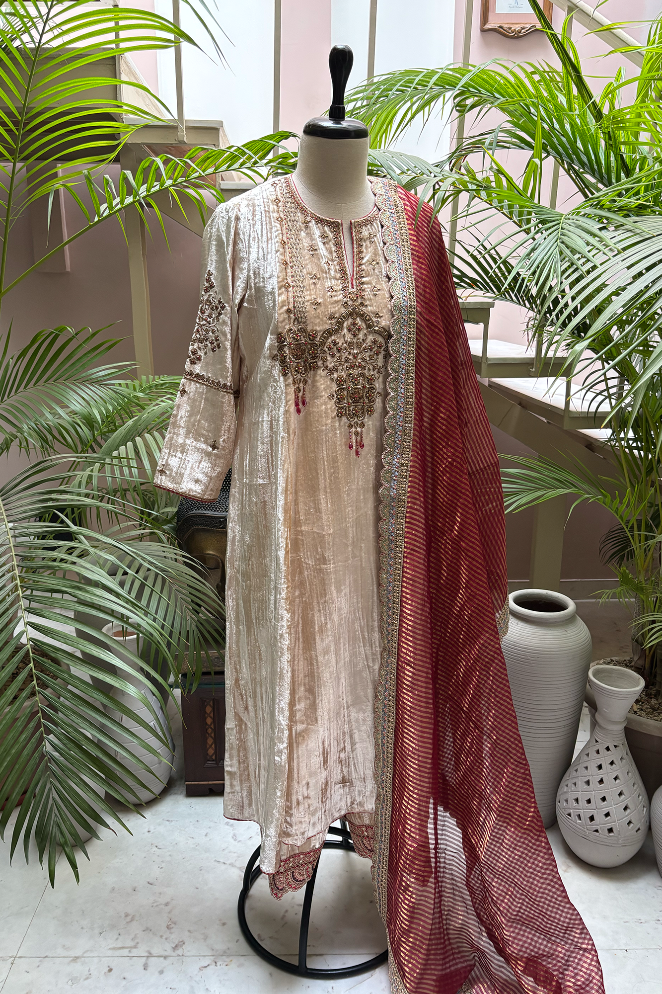 This set is beautifully paired with a gold-striped deep red organza dupatta, finished with a luxurious gold cutwork border.