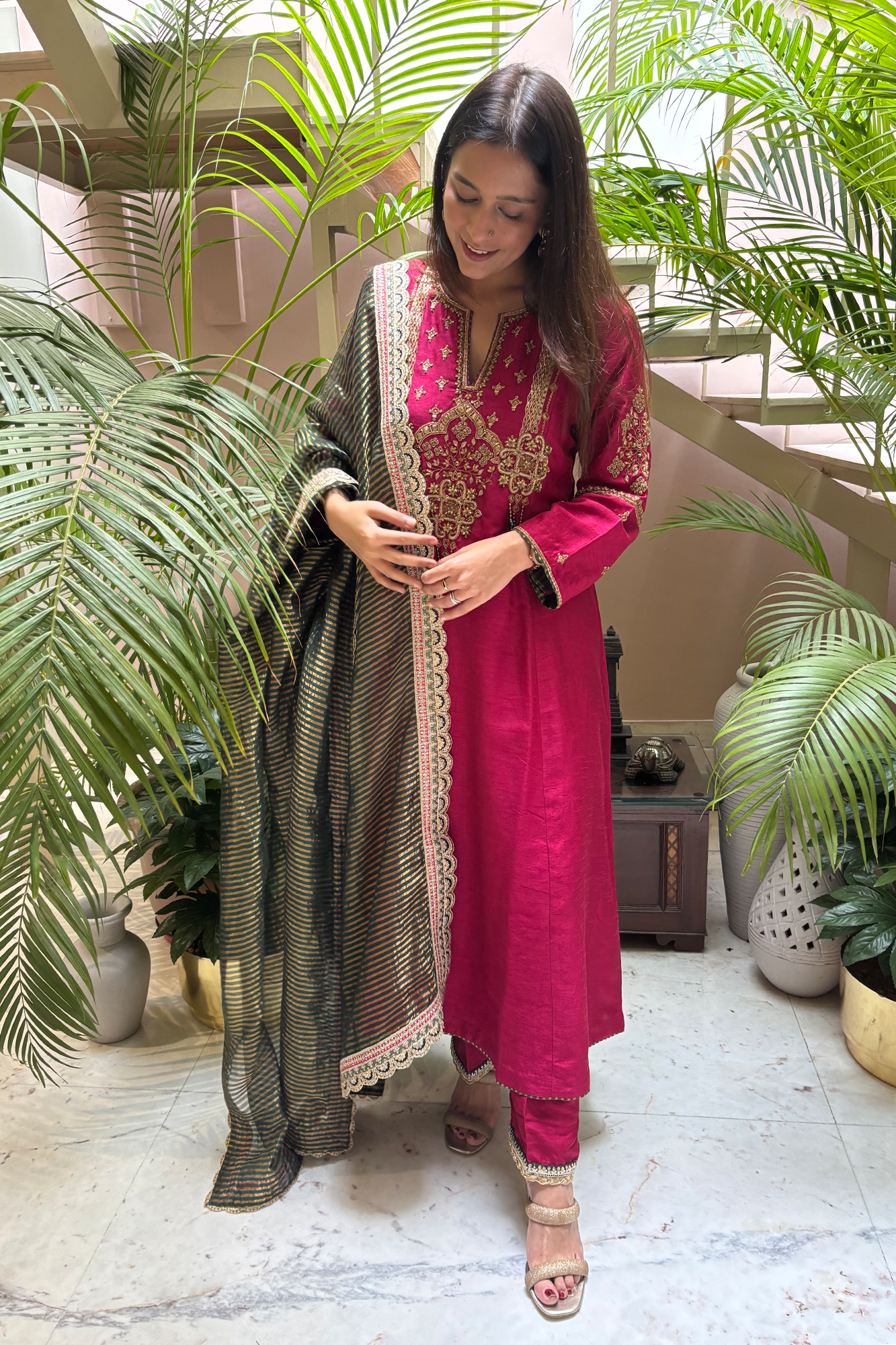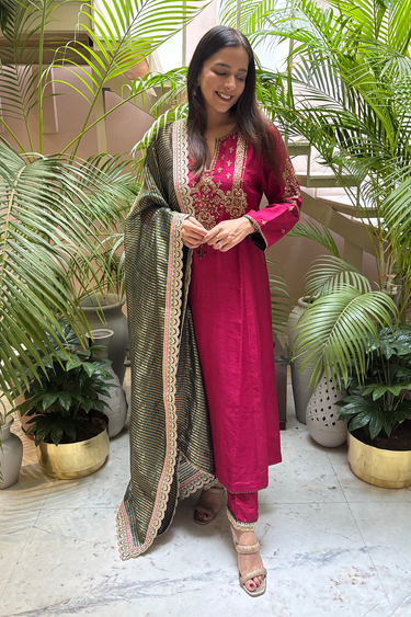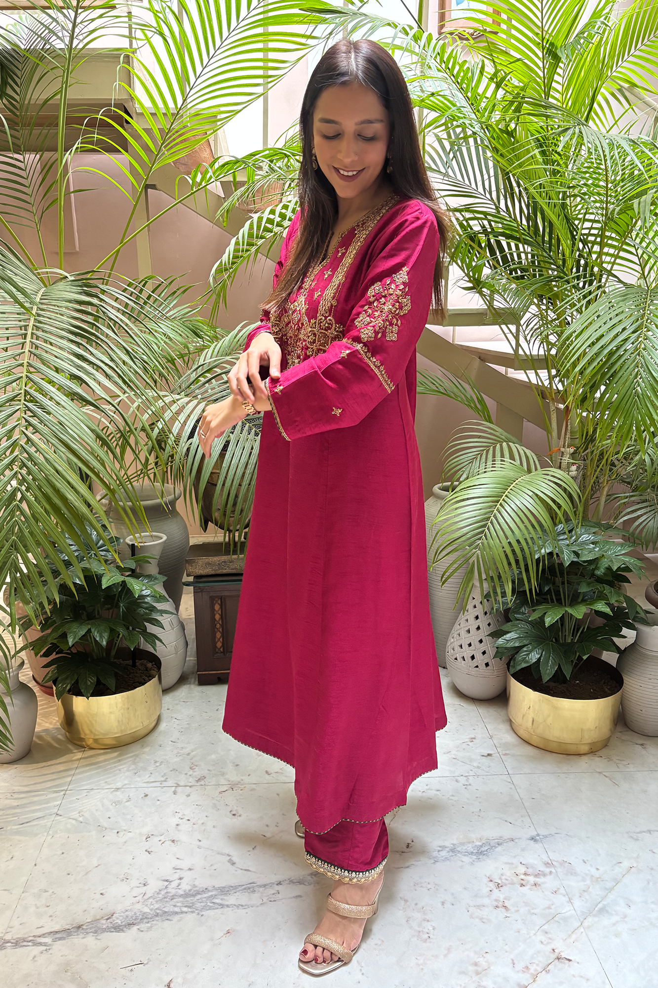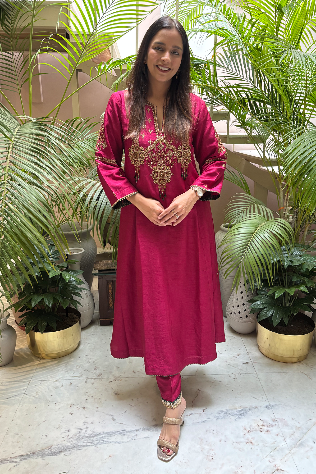 Make a regal statement with this rani pink silk kurta set, featuring a stunning hand-embroidered yoke in dabka and sequin work, enhanced with beaded tassels hanging delicately from the motifs. The sleeves are adorned with dainty hand-embroidered butis and elegant gold borders, adding a touch of intricate craftsmanship to the design.