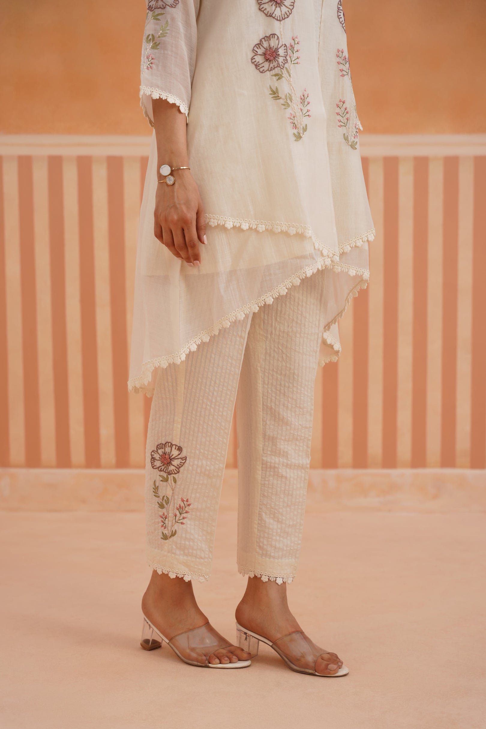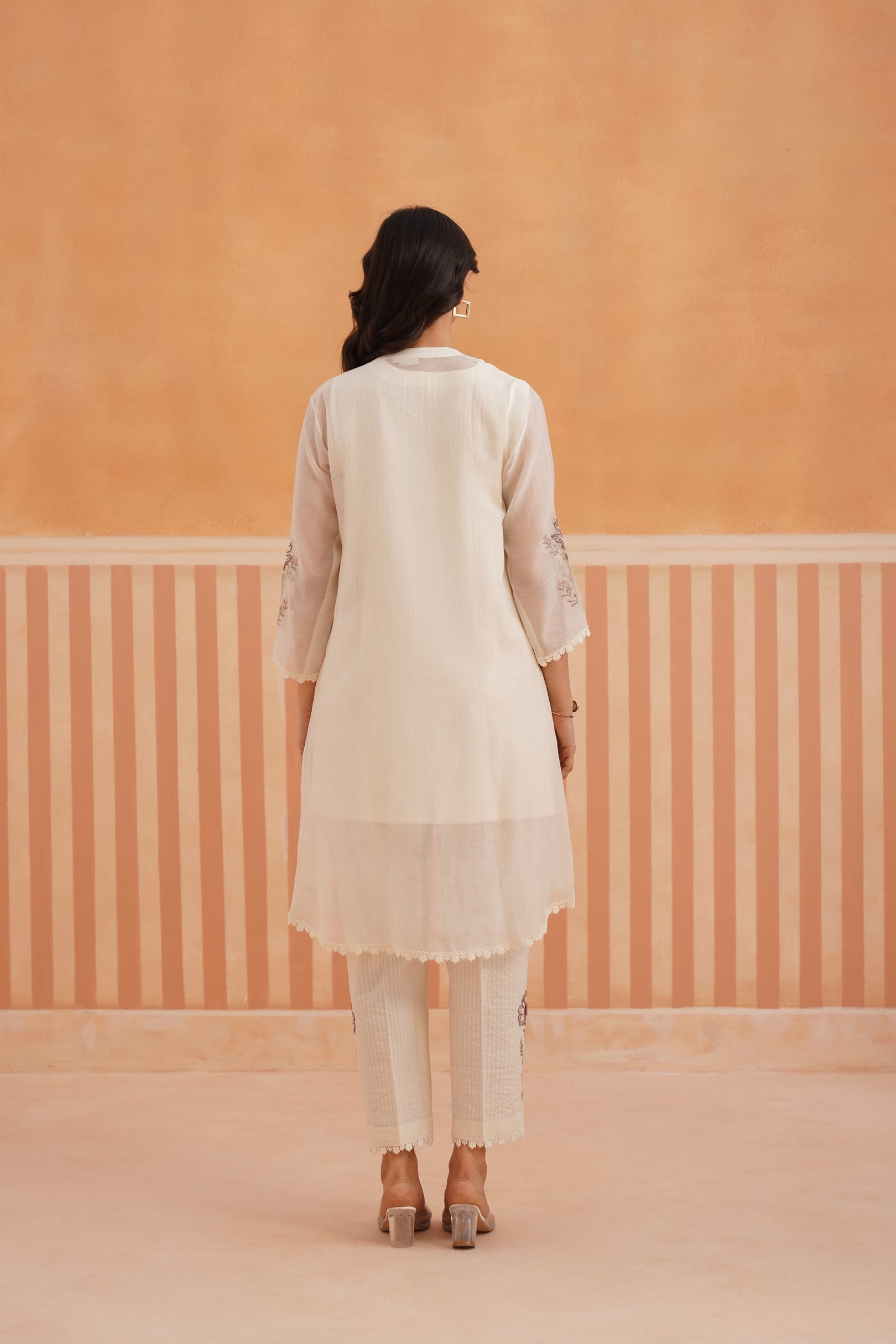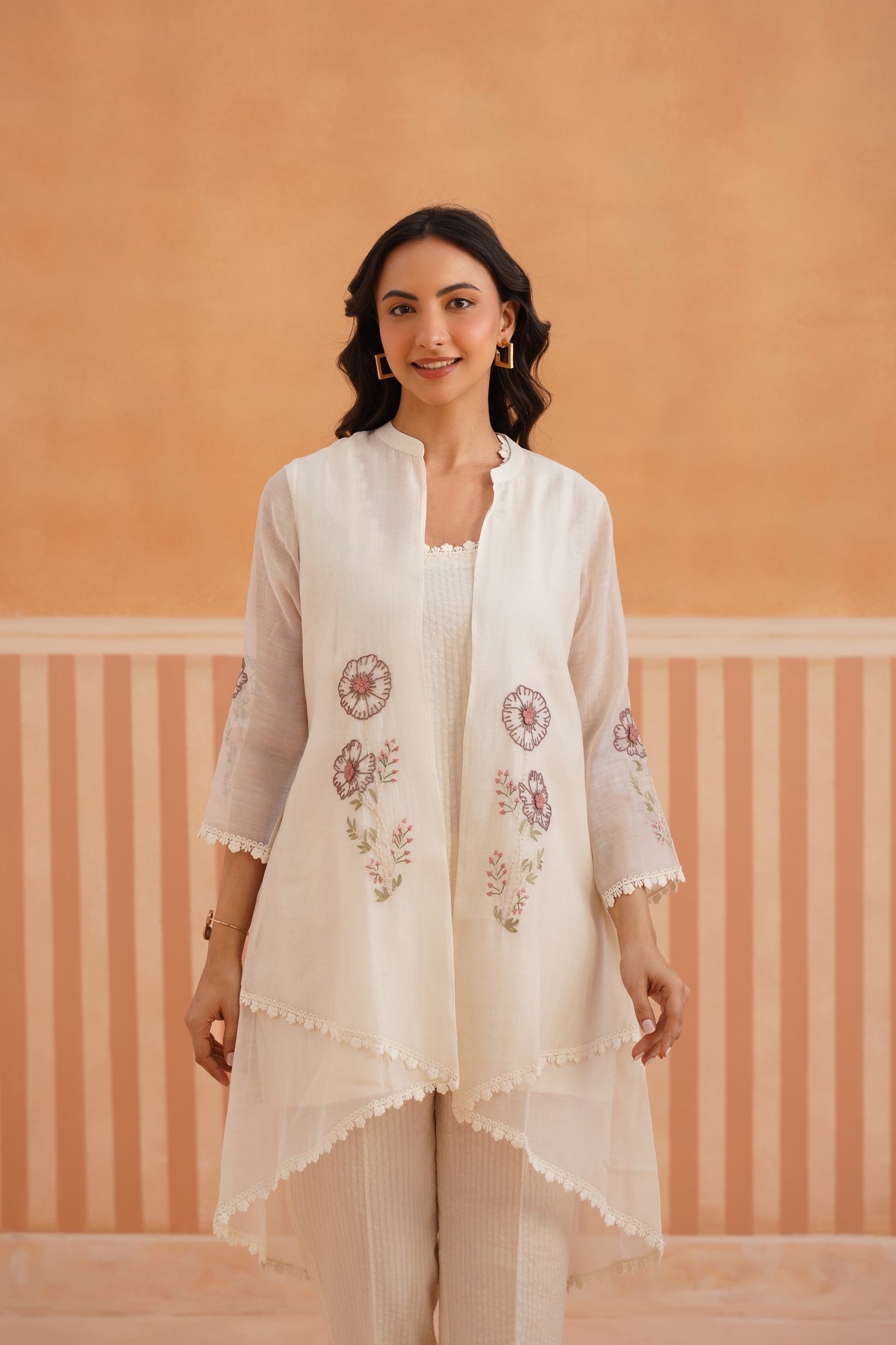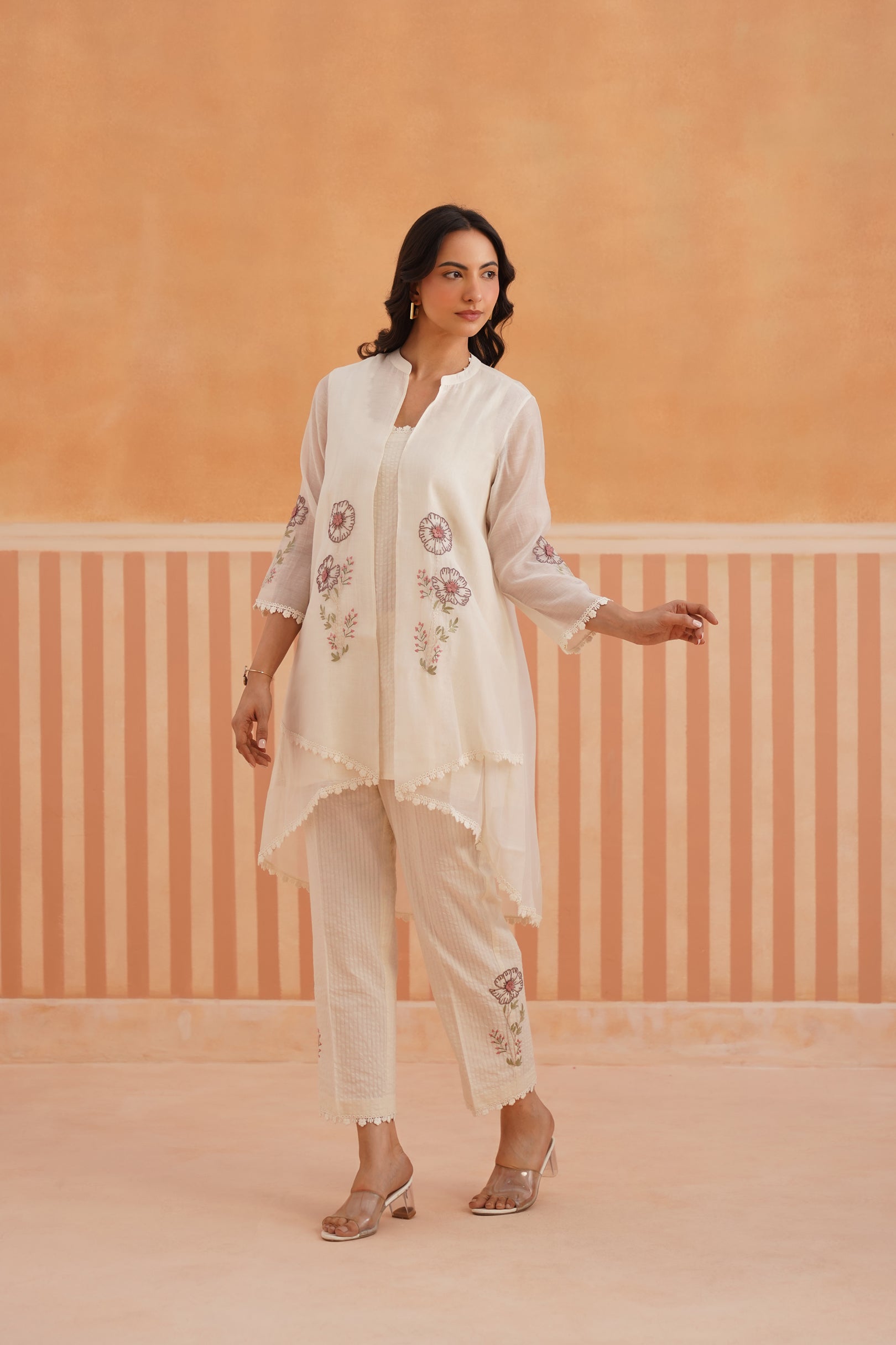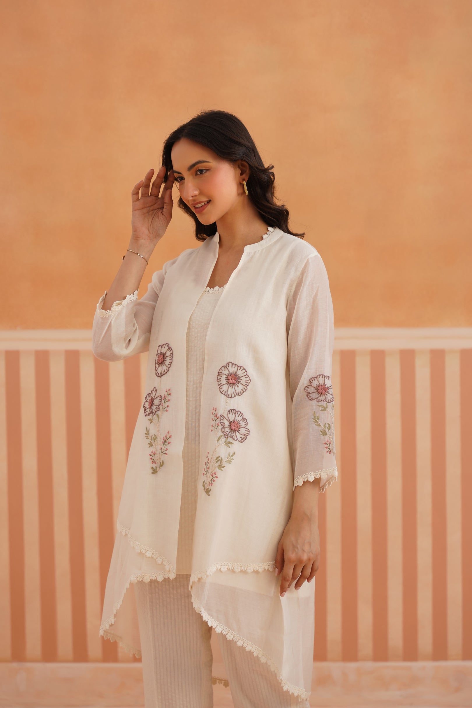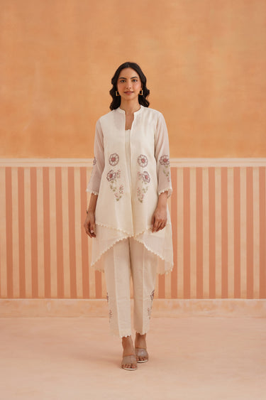 Ivory High-Low Embroidered Jacket Set with Inner and Pants