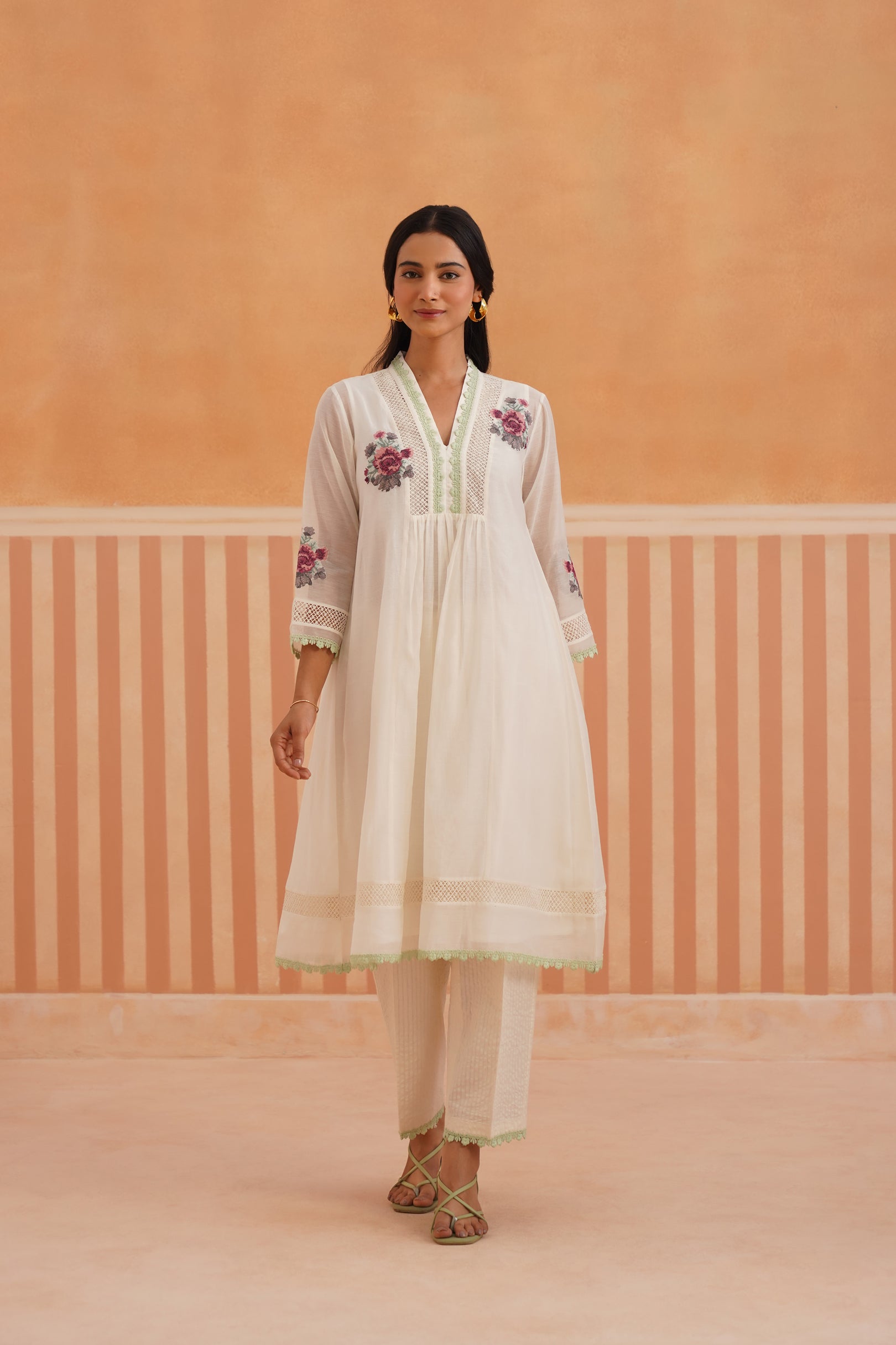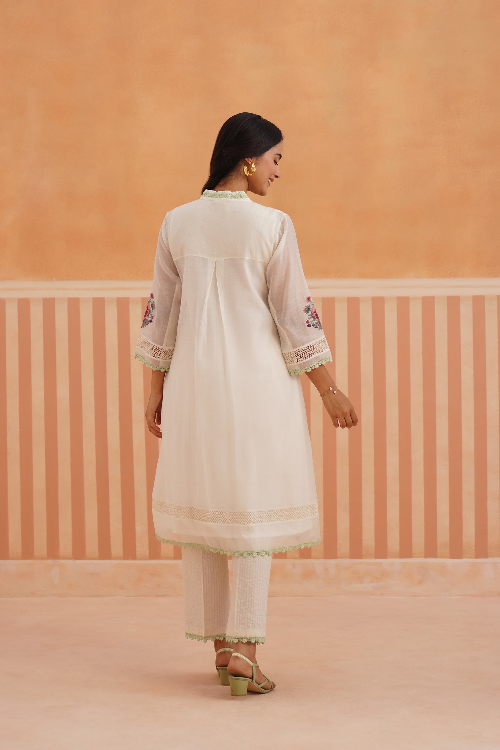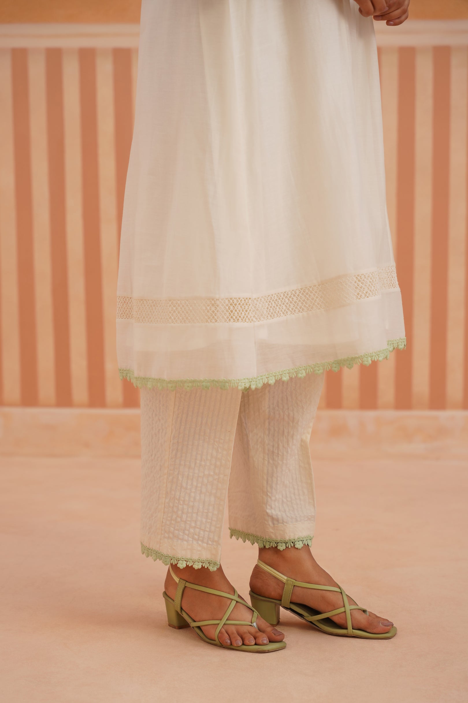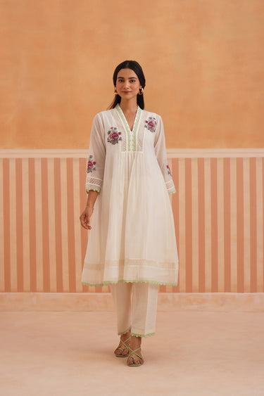 Ivory V-Neck Kurta Set with Sage Green Lace Accents.