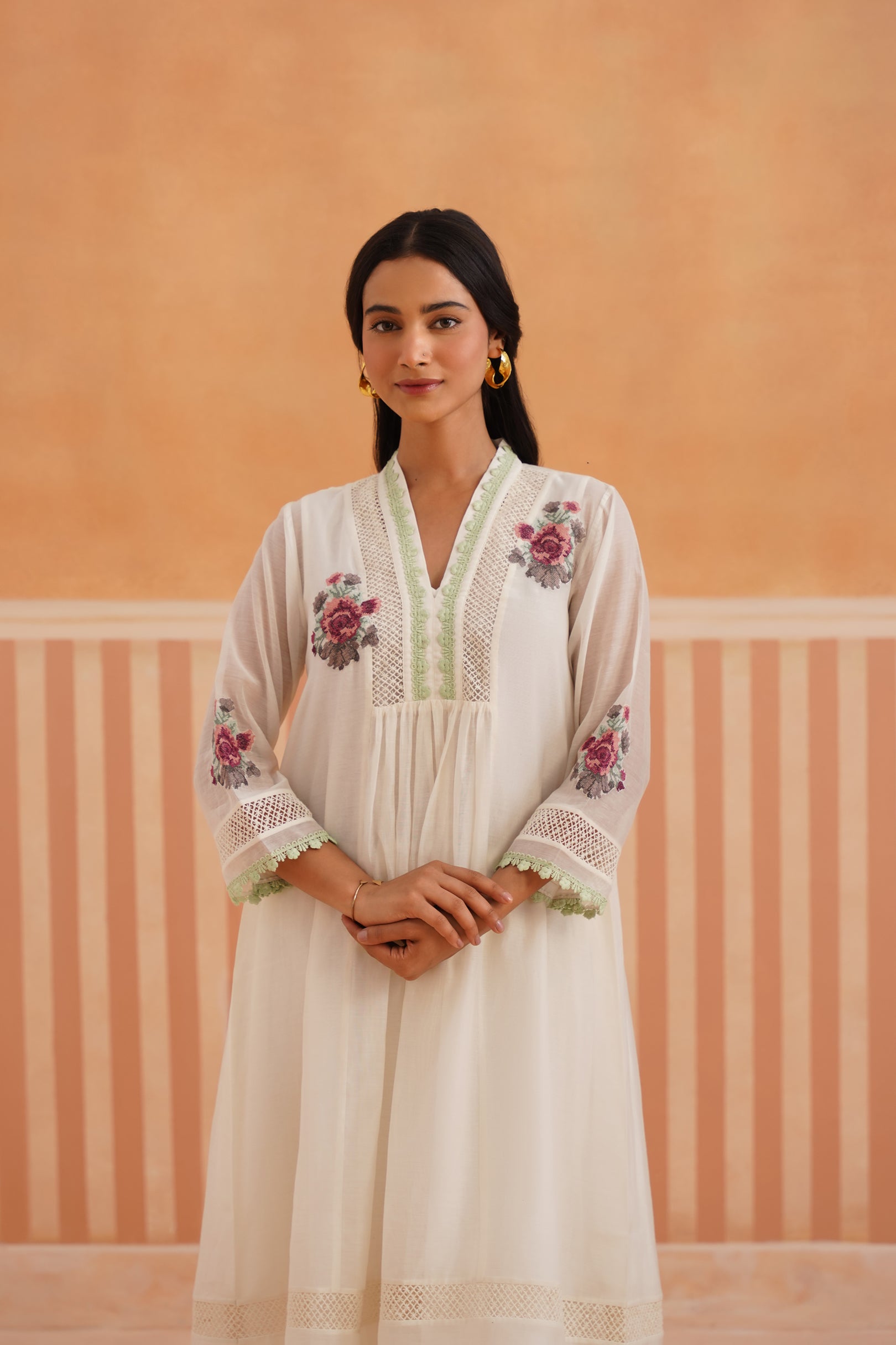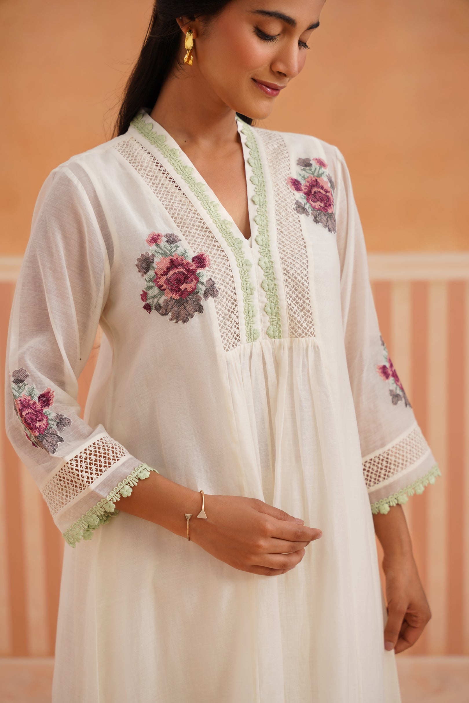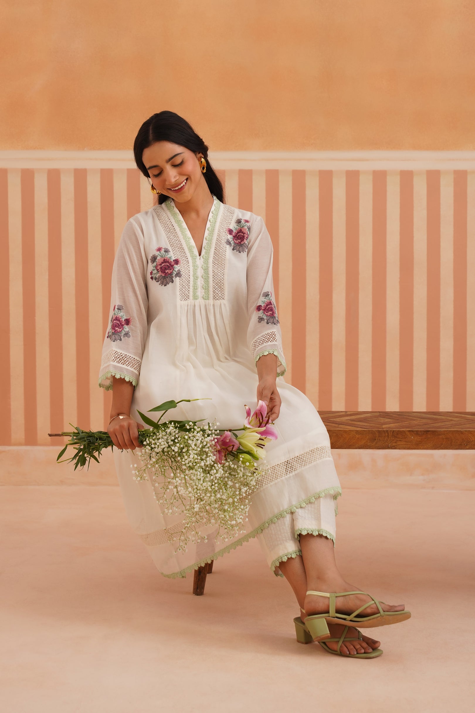 Ivory V-Neck Kurta Set with Sage Green Lace Accents.