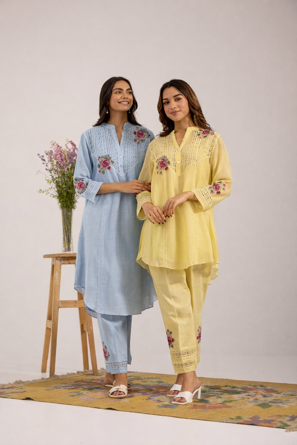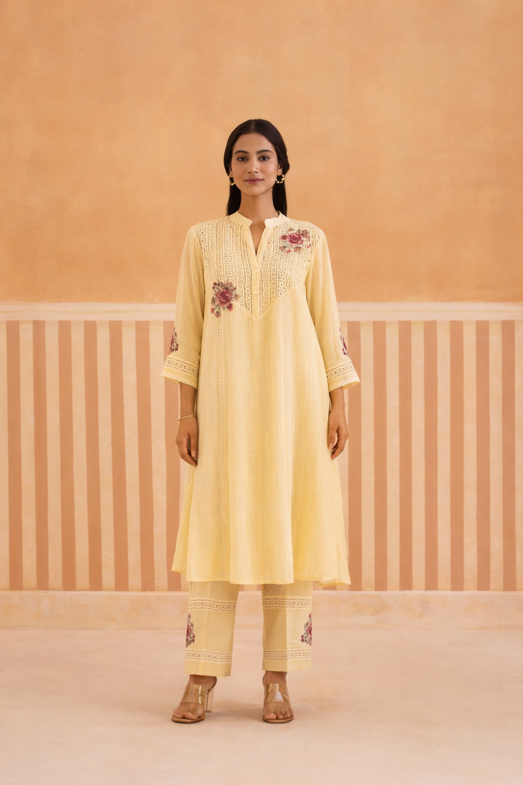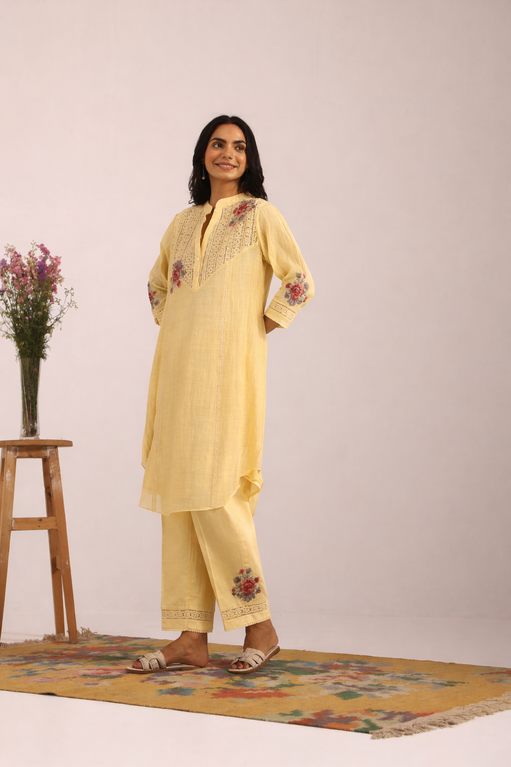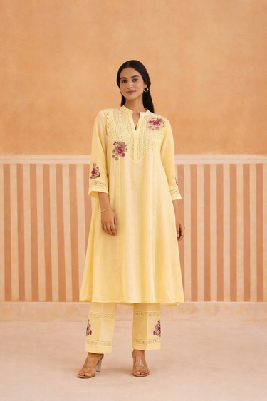 Butter Yellow Mul Chanderi Kurta Set with V-Lace Yoke
