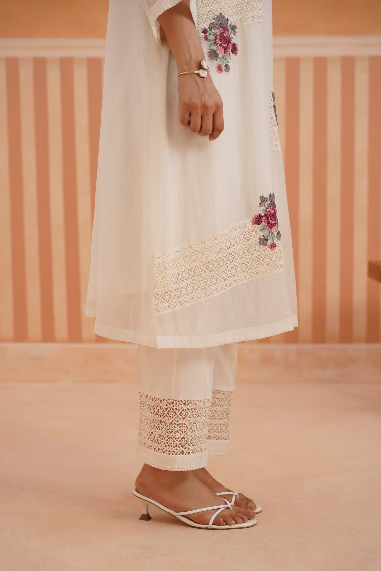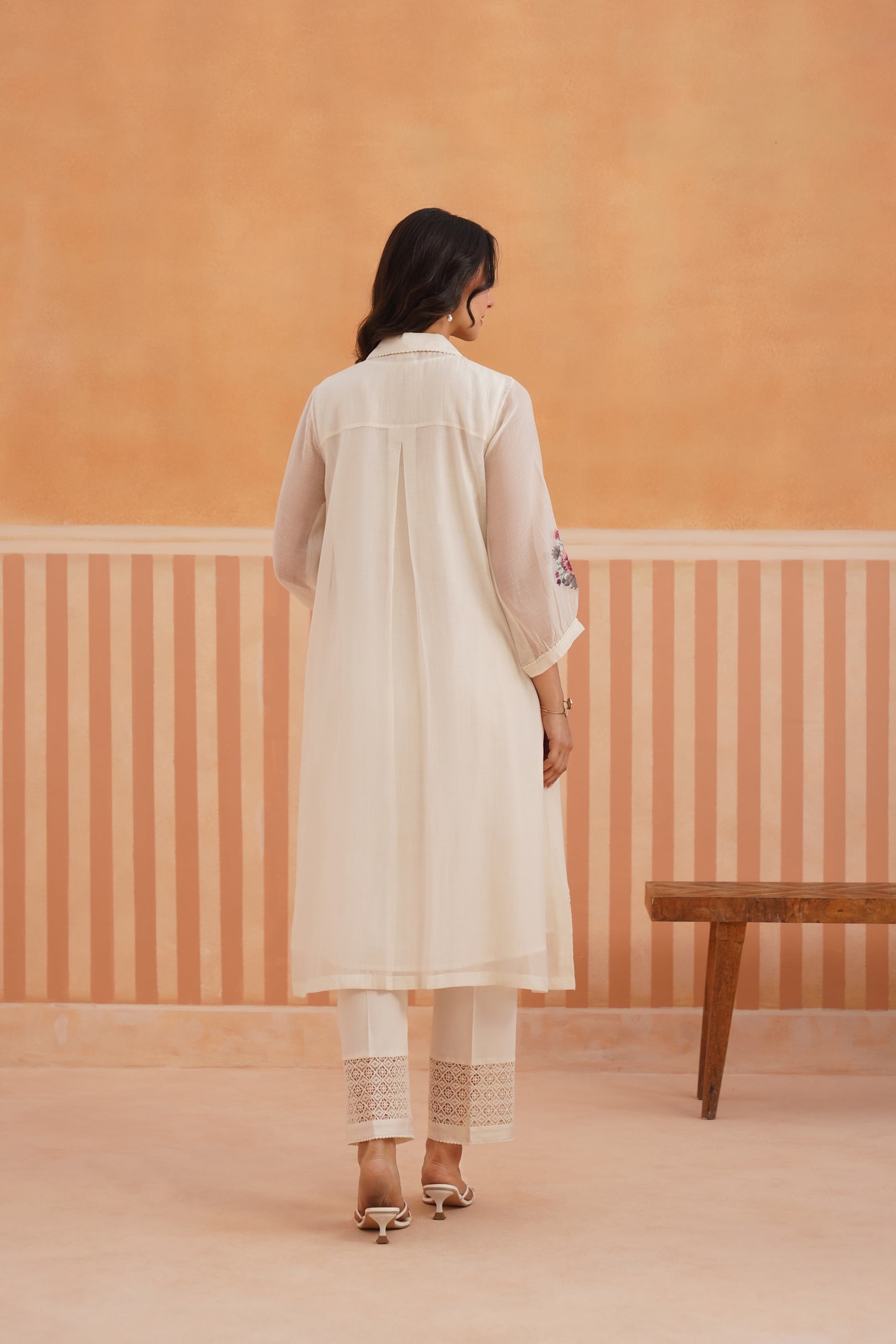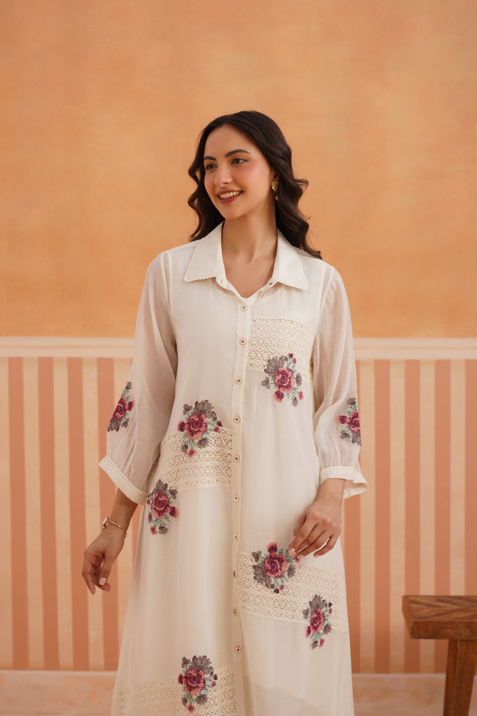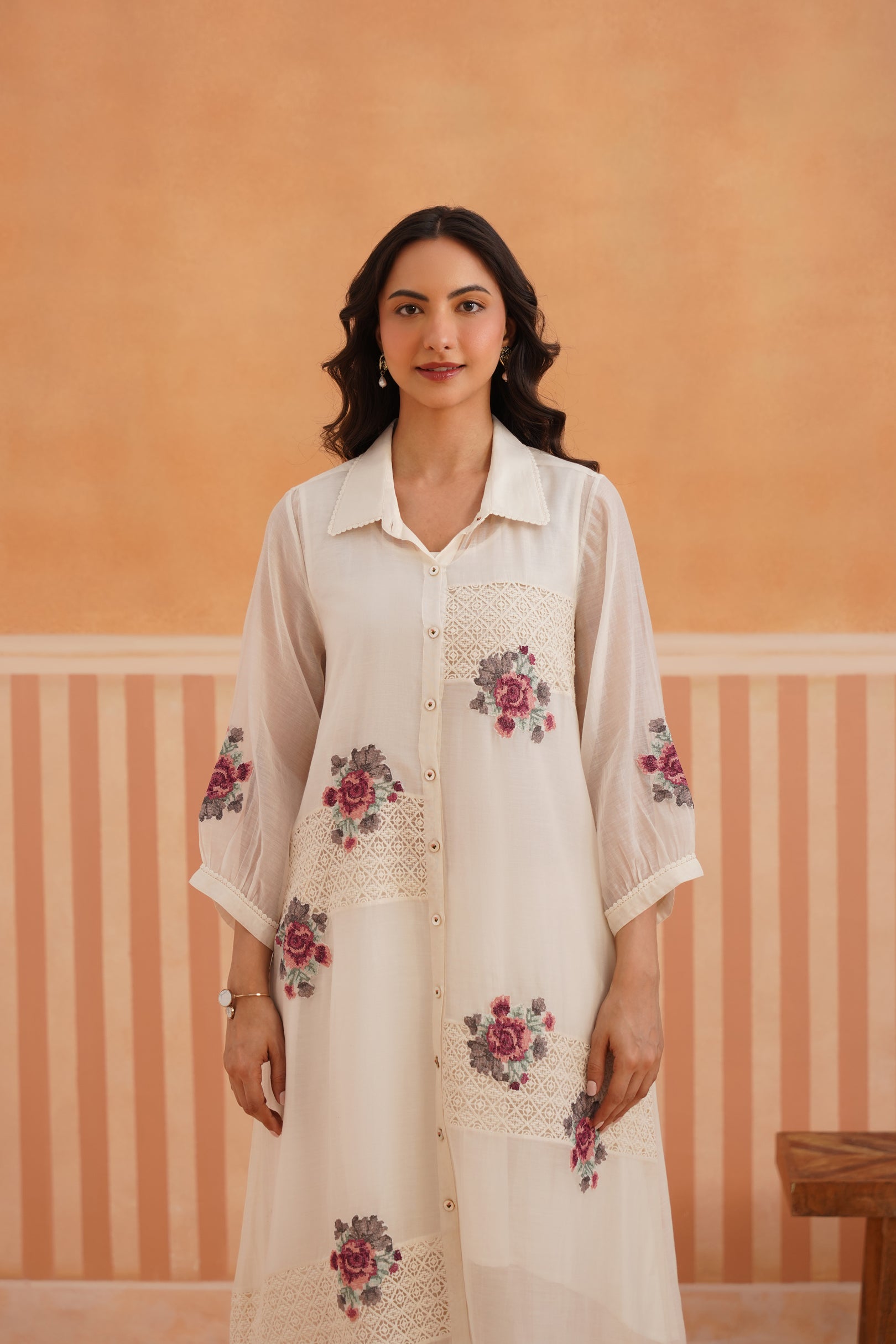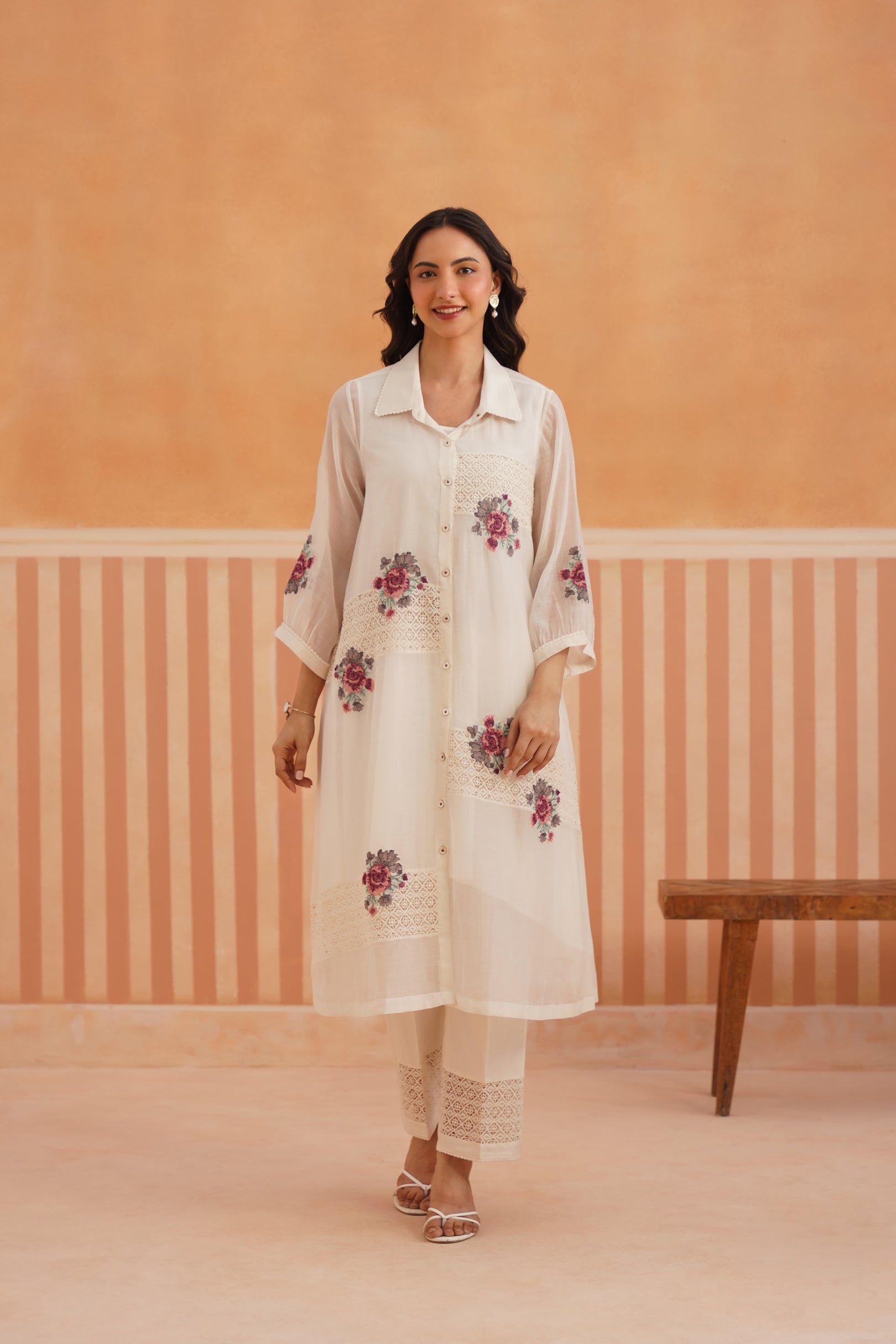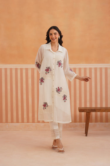 Presenting a summer essential - this collared button-down shirt kurta in sheer, luminous Chanderi, designed with lace detailing on both front panels for a soft, romantic touch. Cross-stitch floral motifs bloom across the shirt and sleeves, blending tradition with modern sensibility. The look is completed with cotton satin pants featuring lace accents and embroidered motifs — creating a poetic ensemble, perfect for summer gatherings and sunlit days.