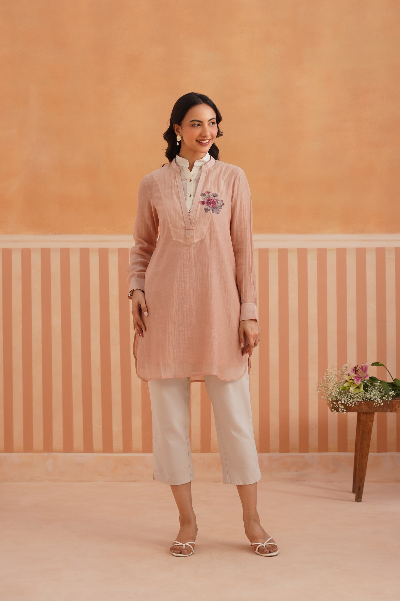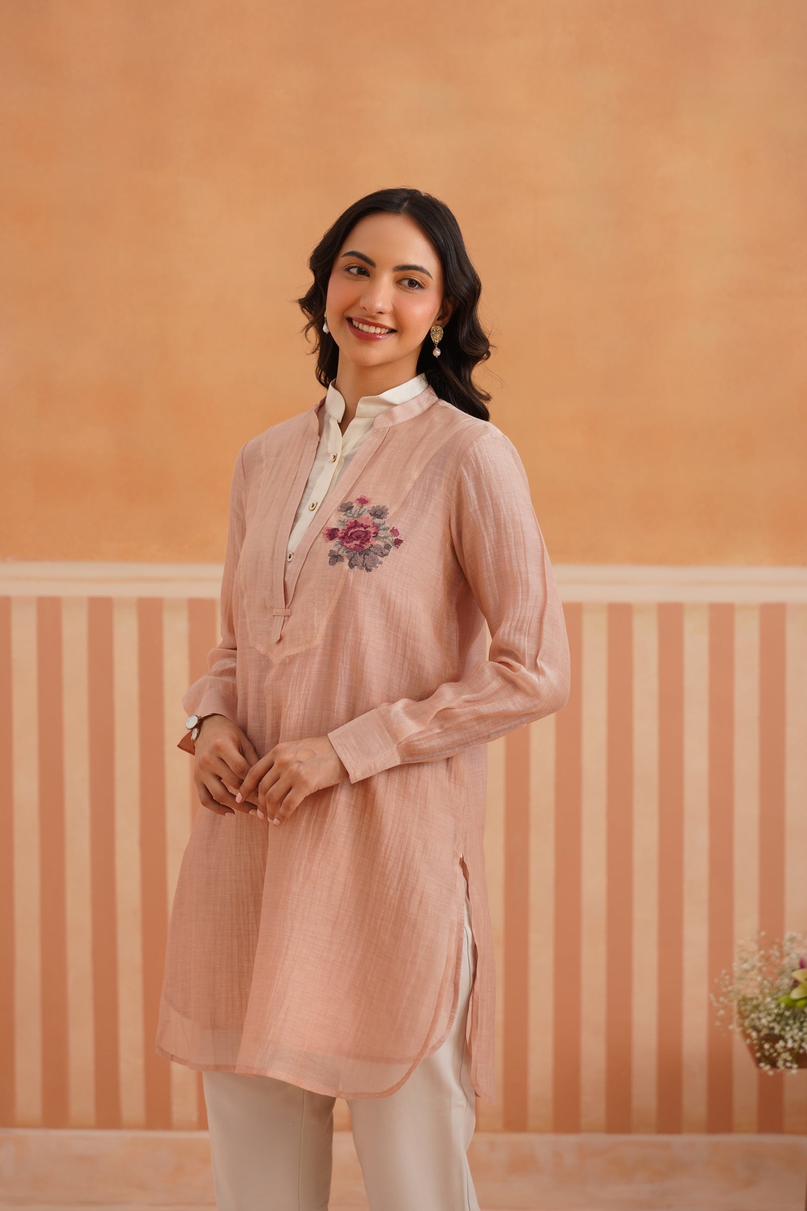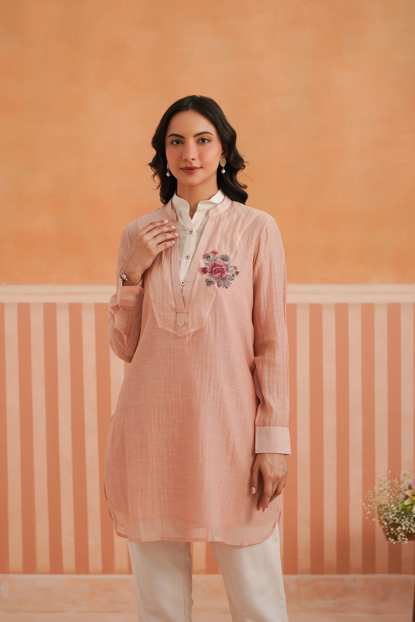 Pink Double Collared Chanderi Tunic with Floral Embroidery