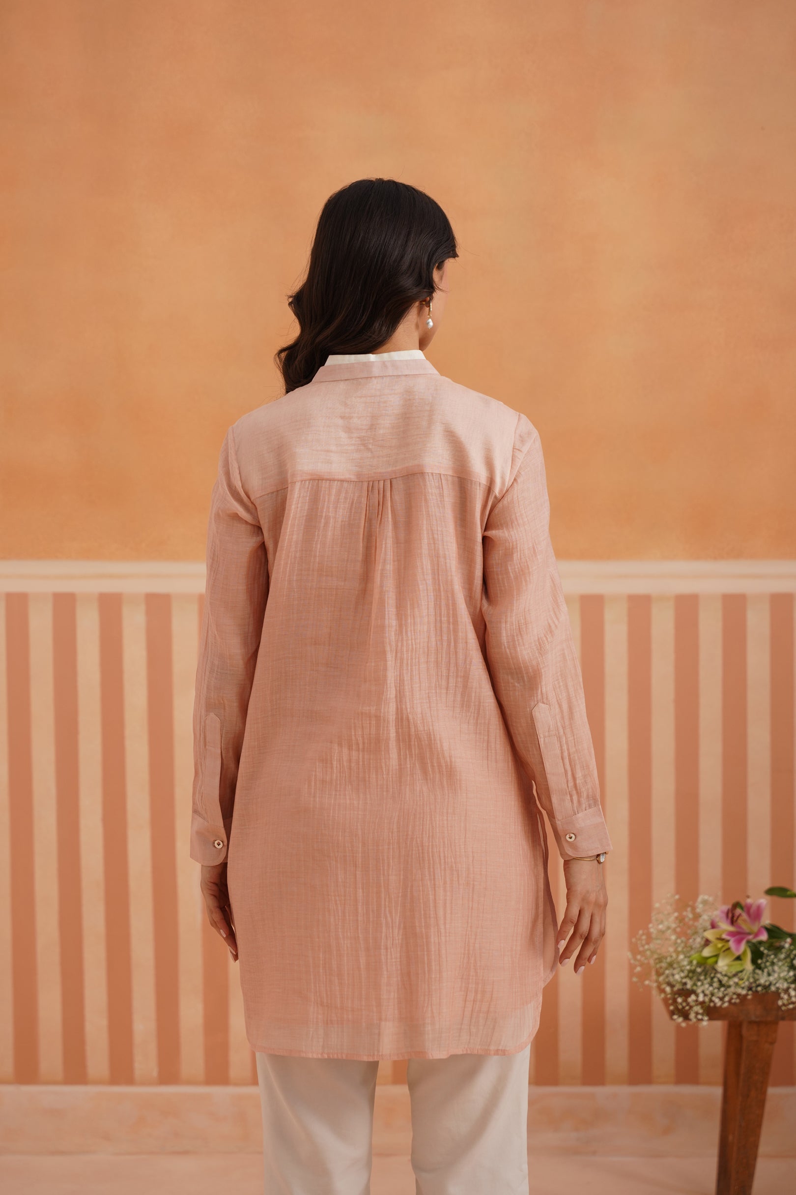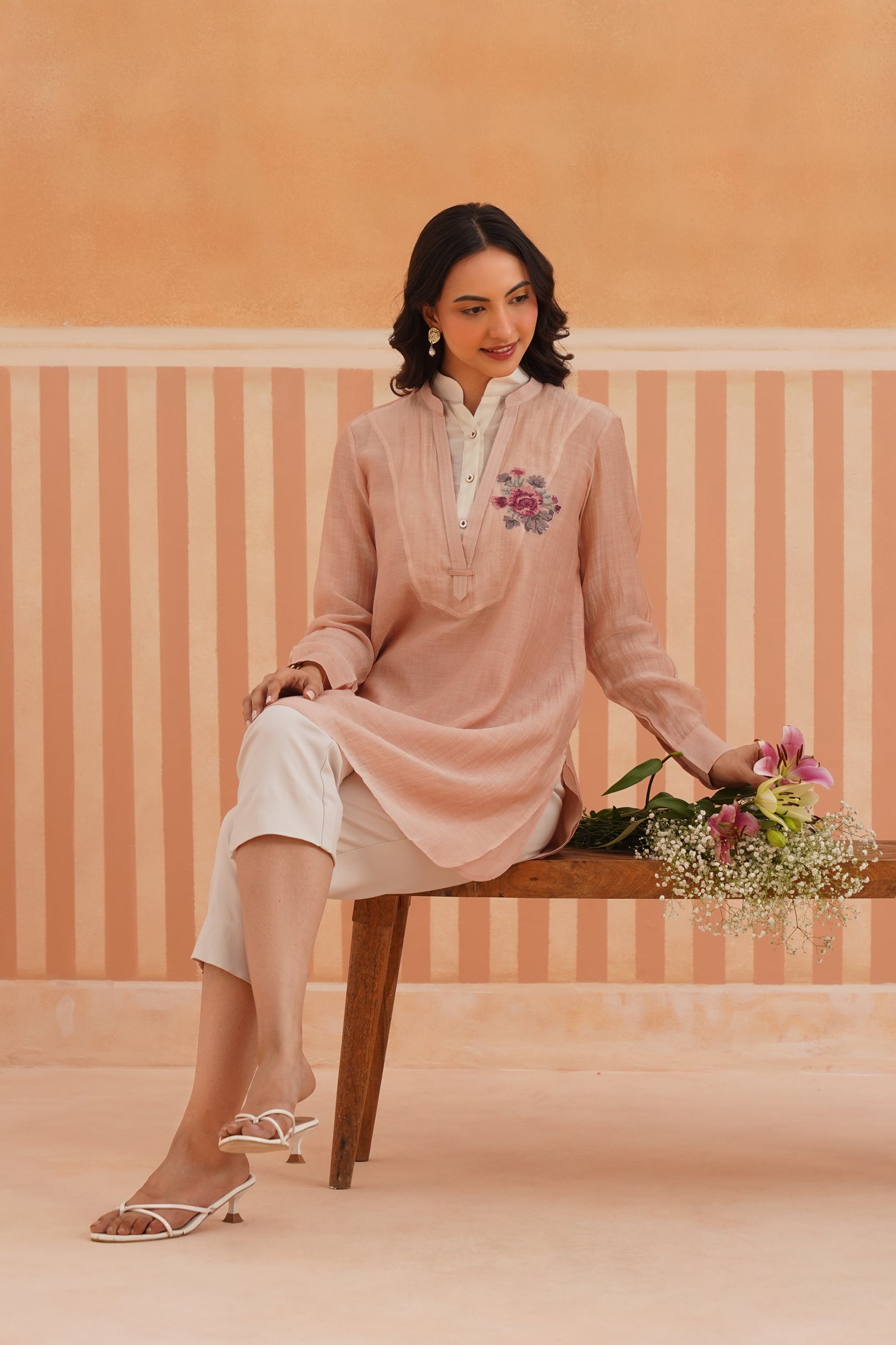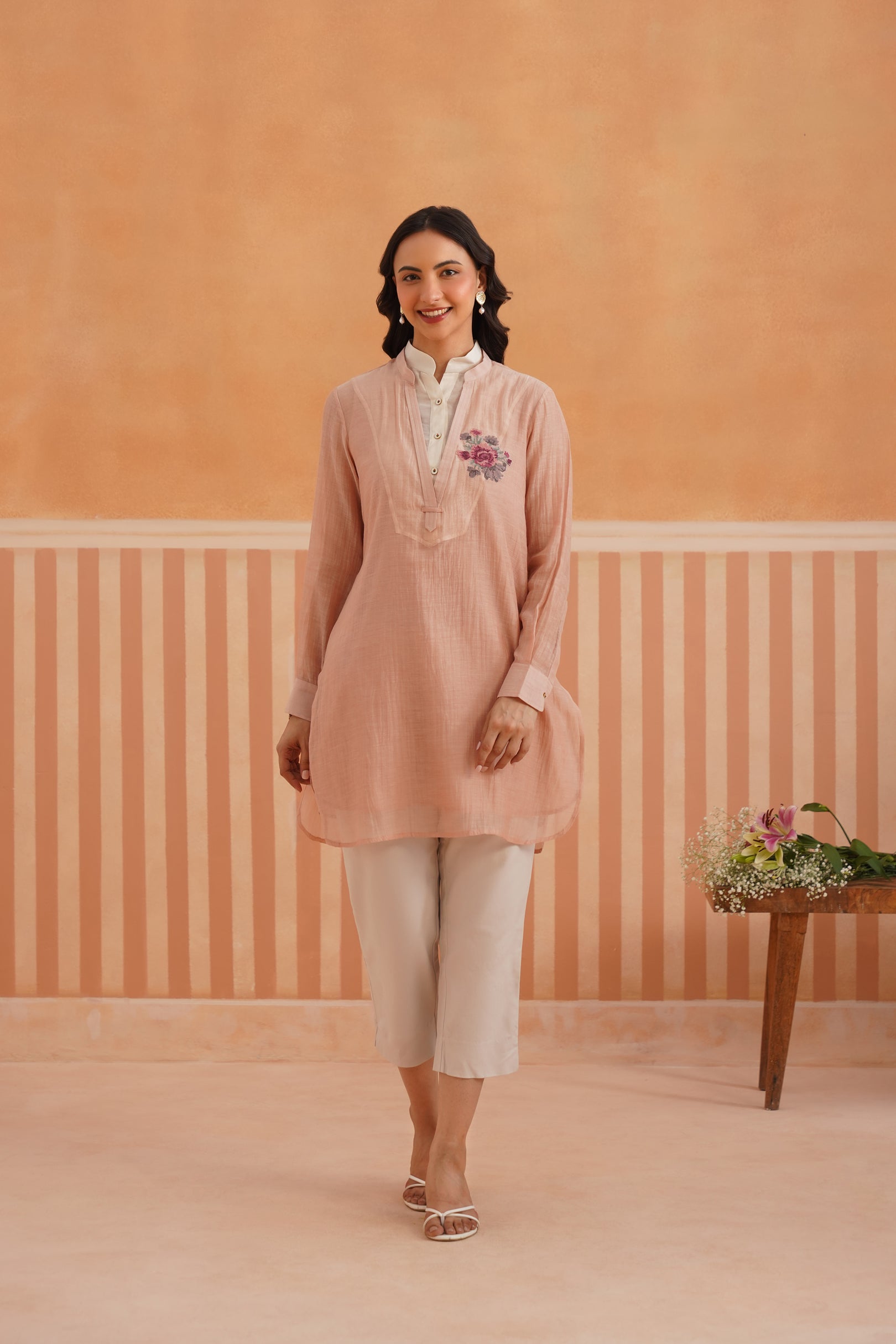 Pink Double Collared Chanderi Tunic with Floral Embroidery