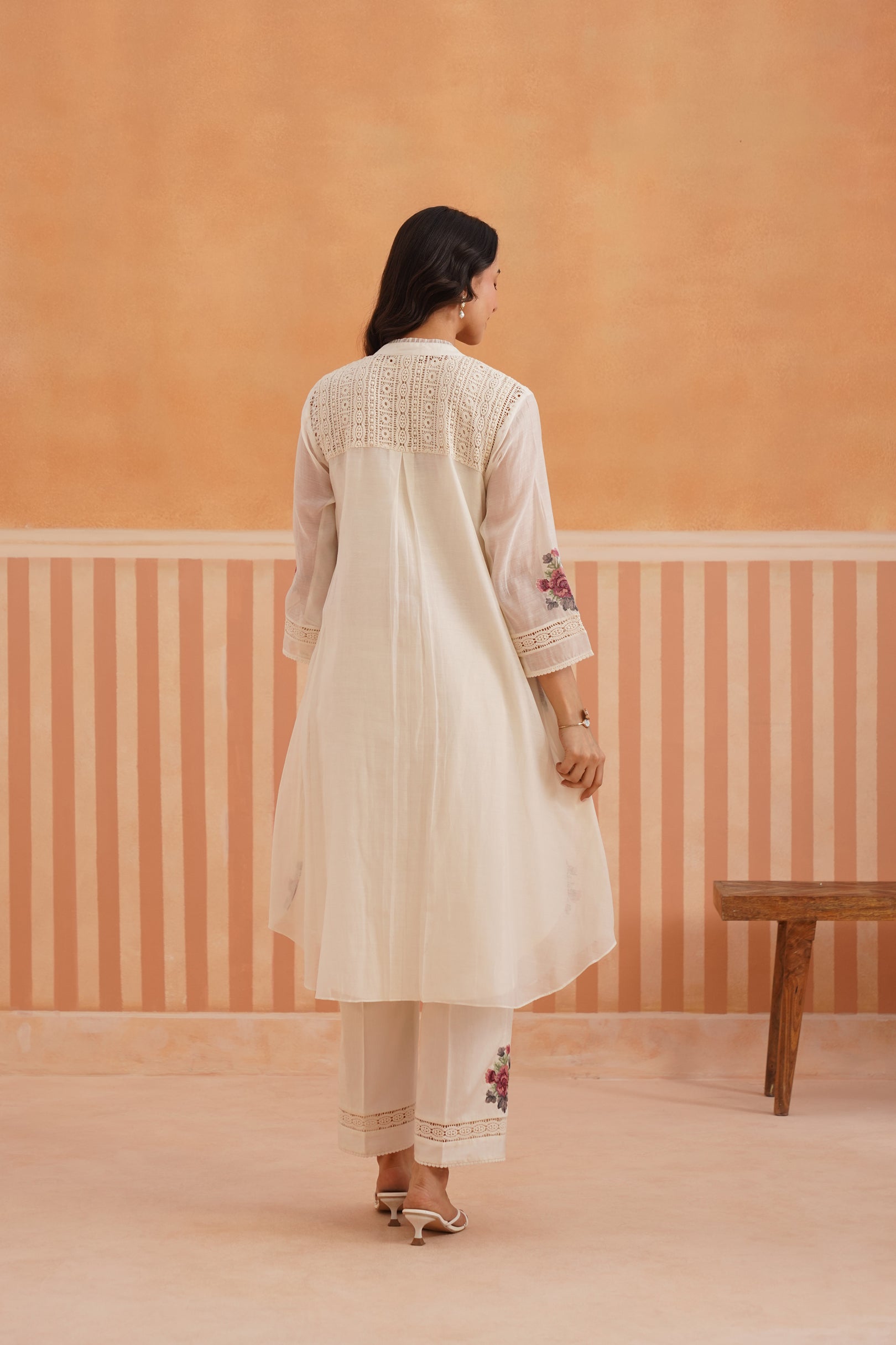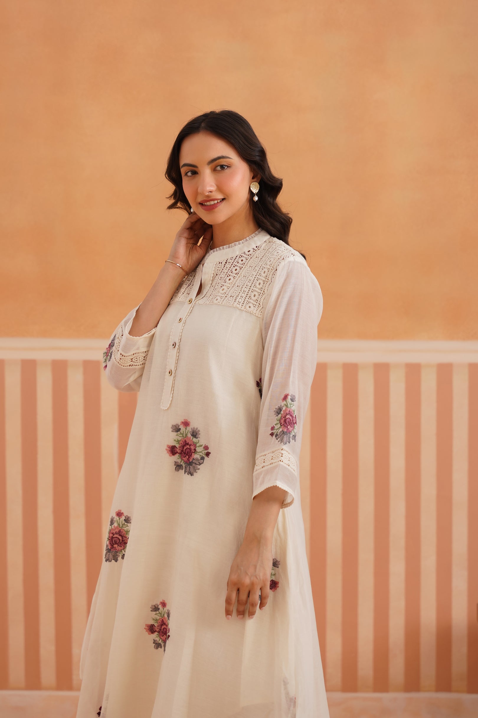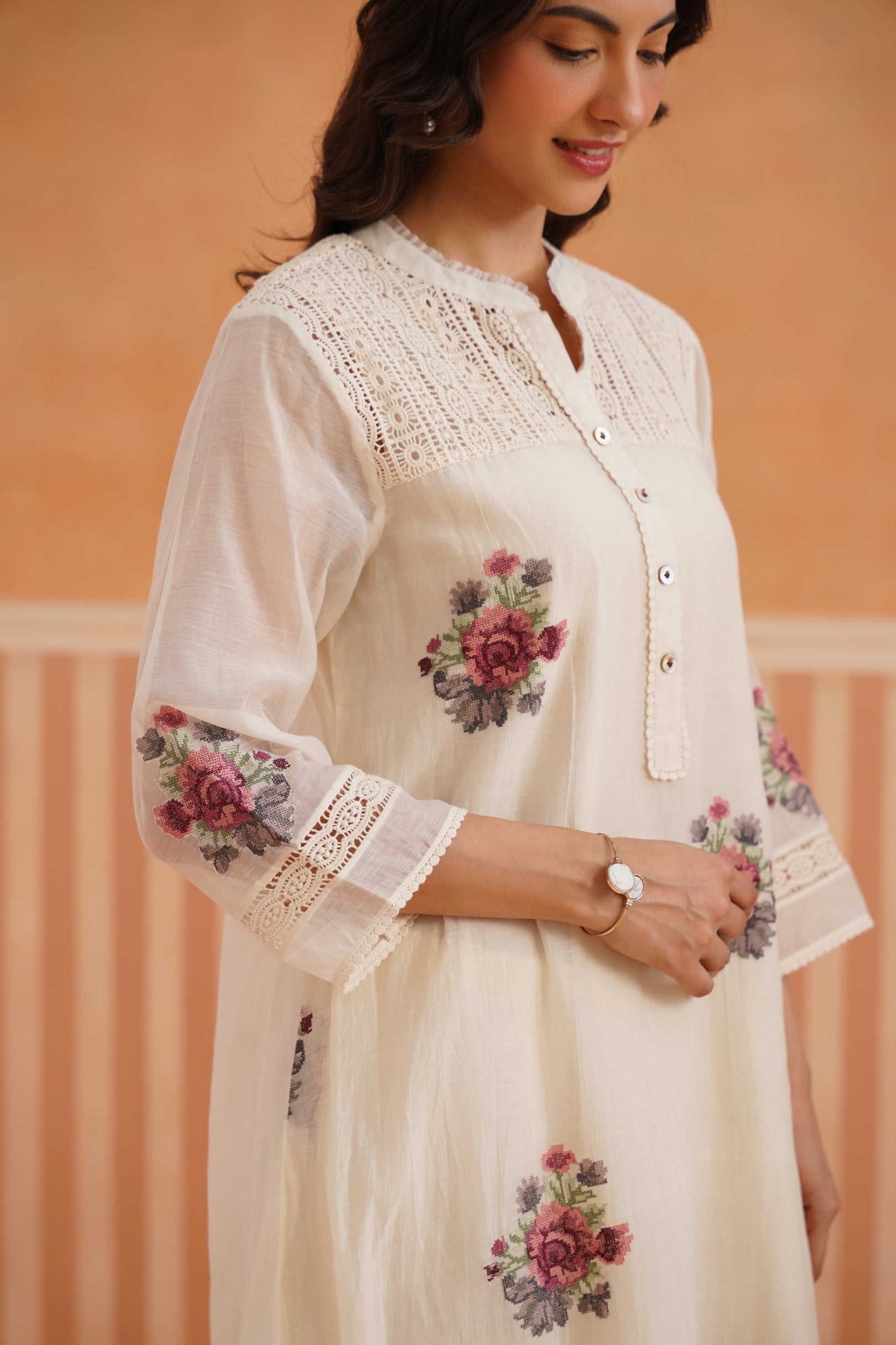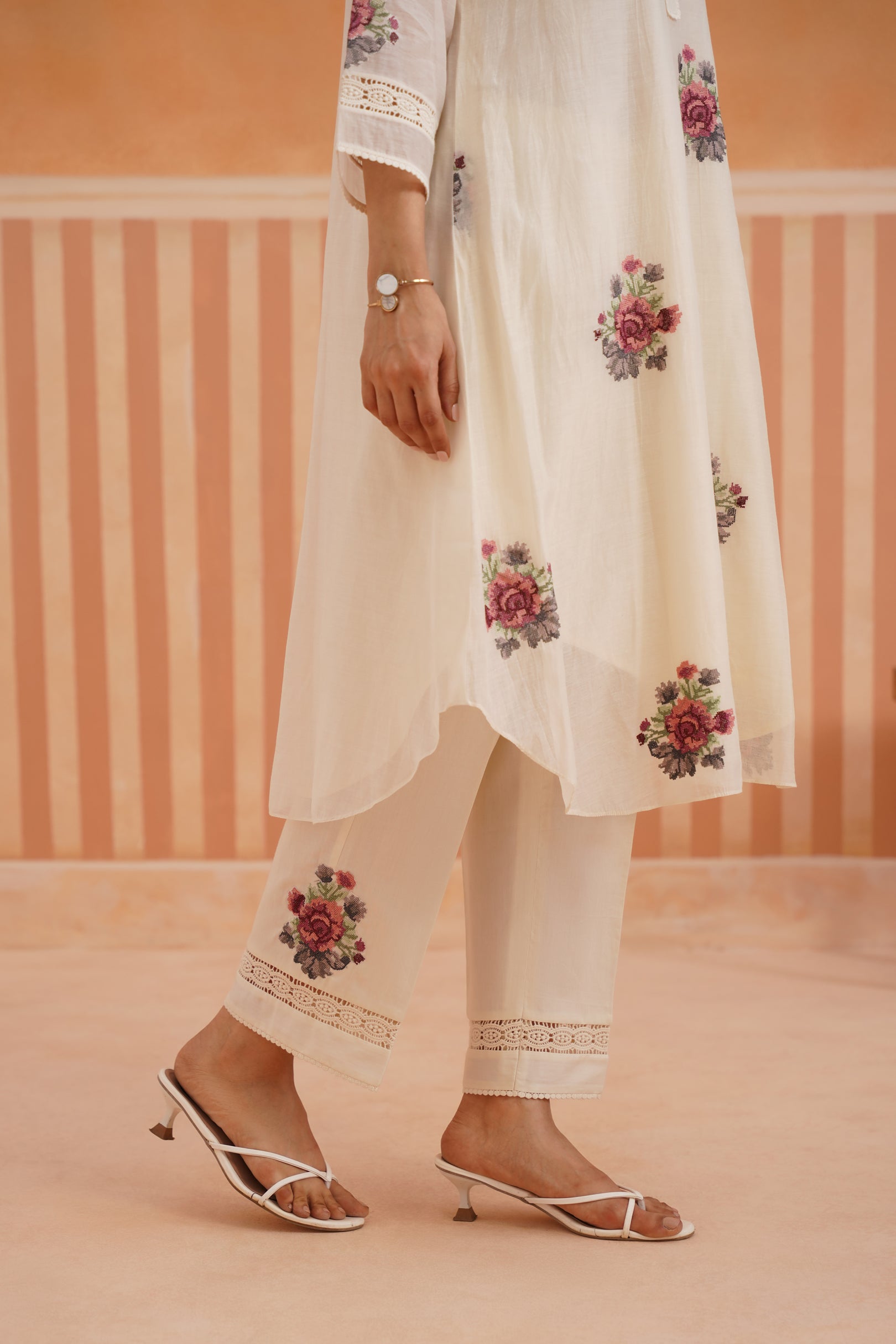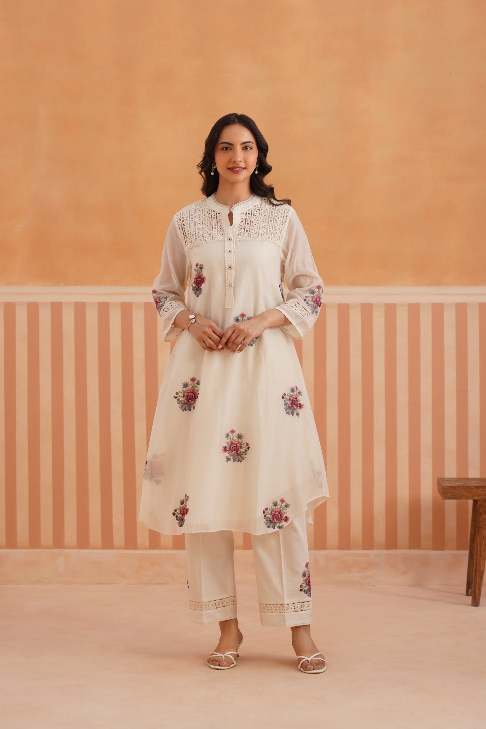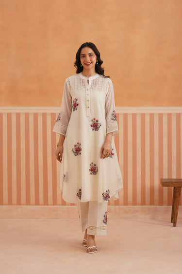 Ivory Floral Embroidered Mul Chanderi Rounded Kurta Set