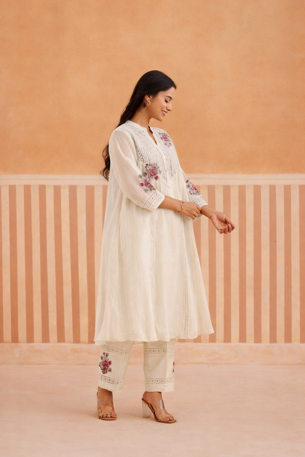 Off-White Mul Chanderi Kurta Set with V-Lace Yoke